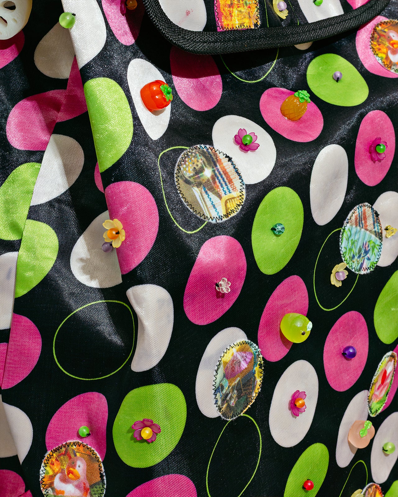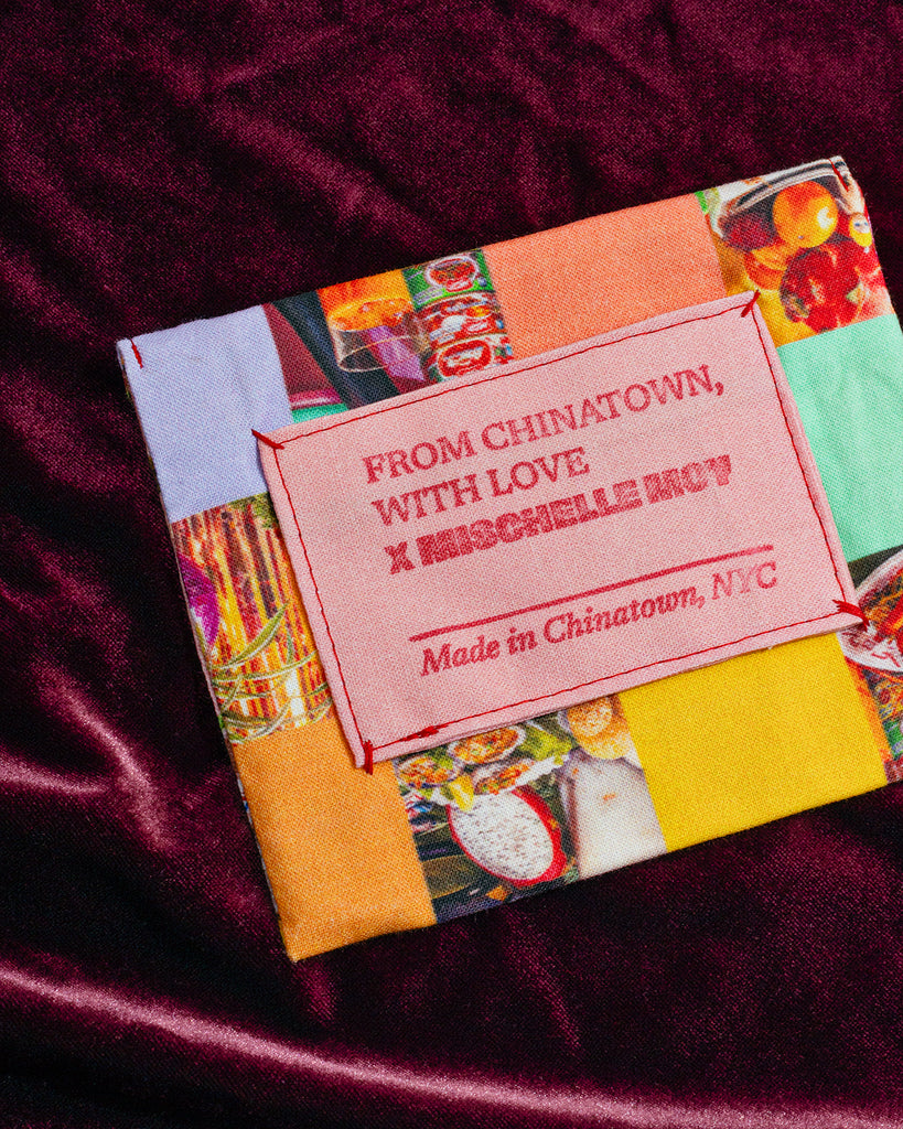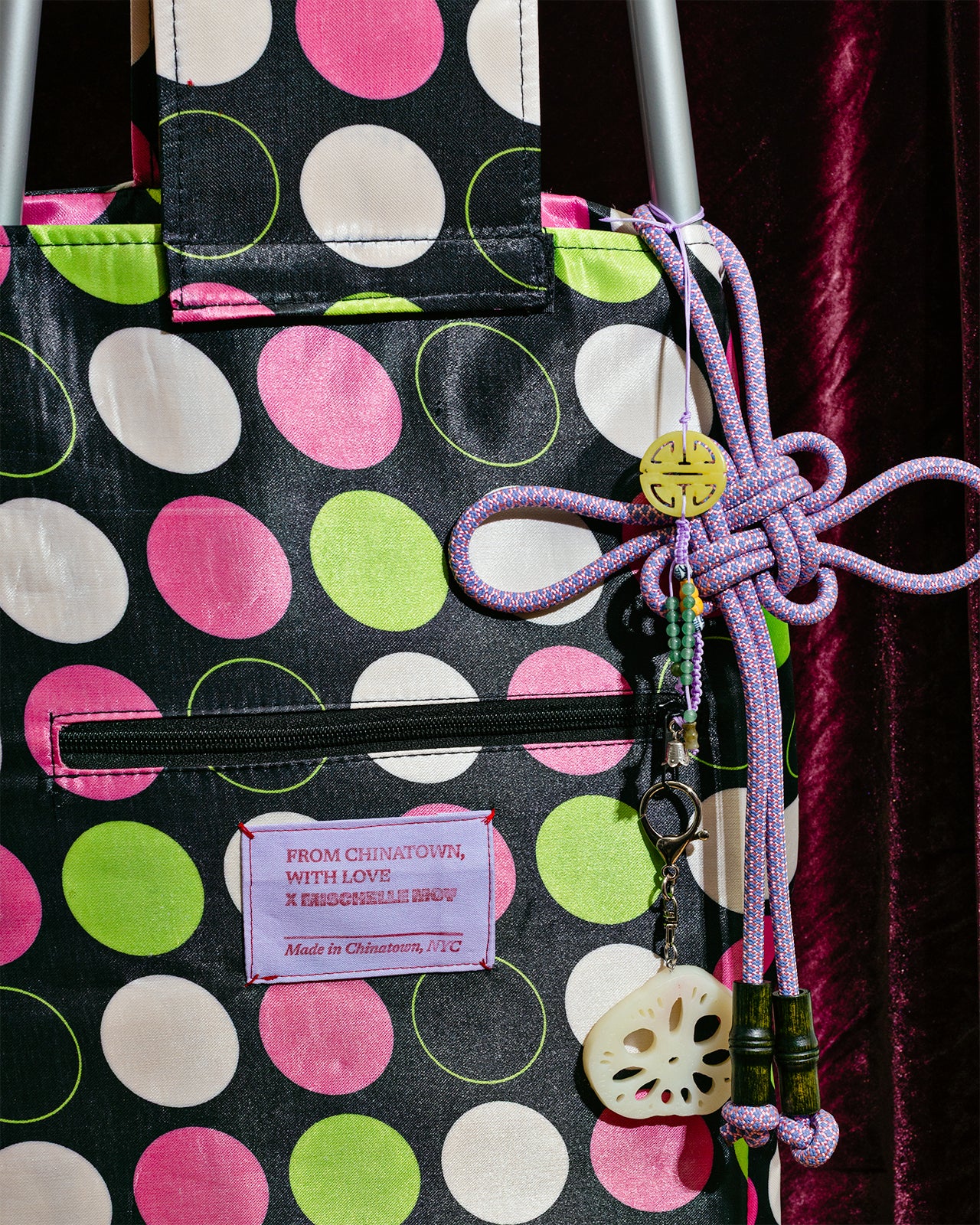 An iconic Chinatown essential, the granny cart is a workhorse for hauling all of your everyday groceries. This polka-dotted and hand-beaded cart boasts a bedazzled touch that will catch everyone’s eye rolling along Chinatown’s main drags, featuring circular print patches from a From Chinatown With Love 2021 photo of items from K.K. Discount, floral beads, and fruit-theme embellishments, as well as a bonus change purse. The granny cart also comes with one-of-a-kind bag charms: Wing on Wo’s talisman and a supersized paracord good luck knot tied by Mischelle Moy.