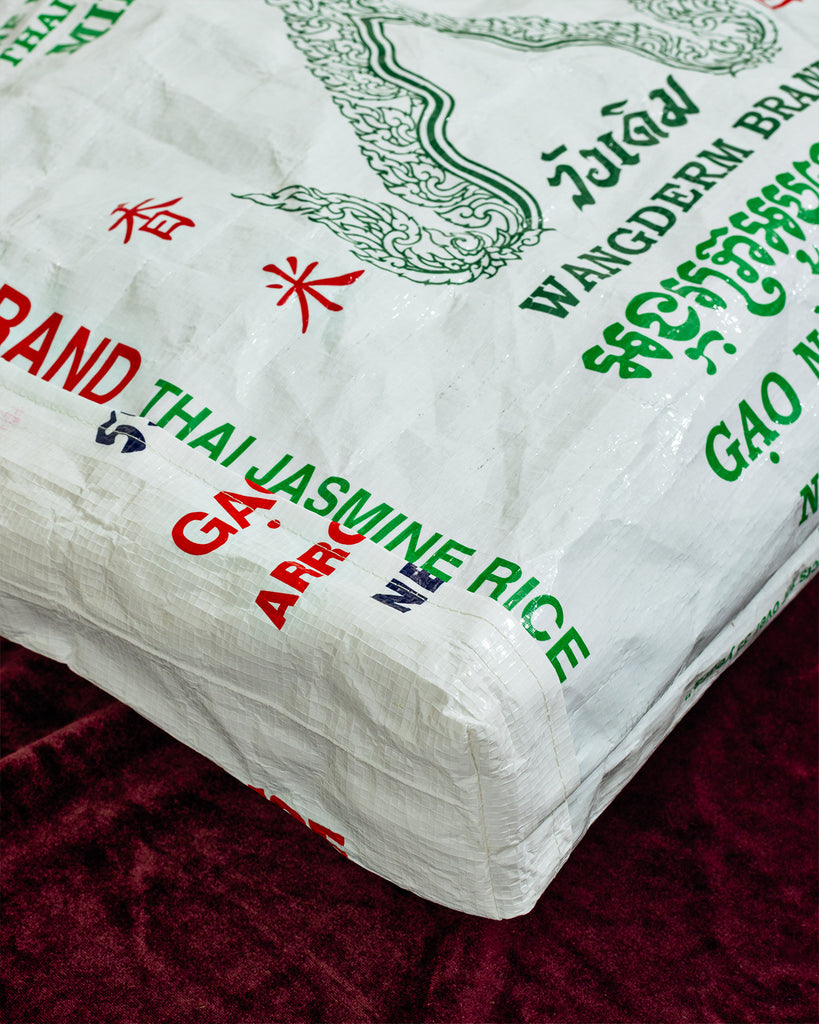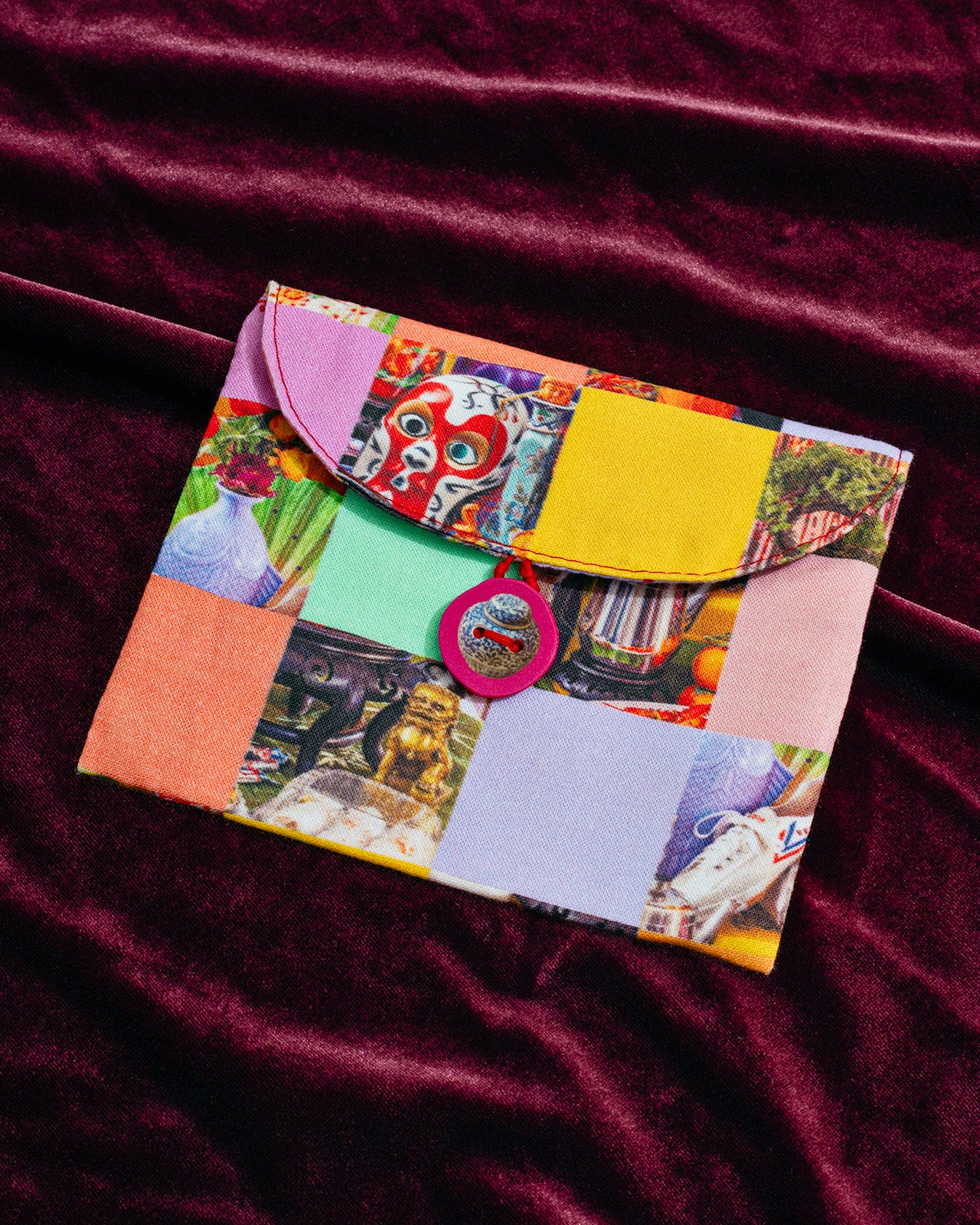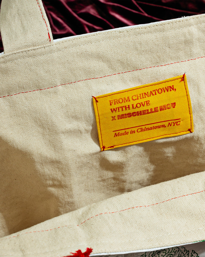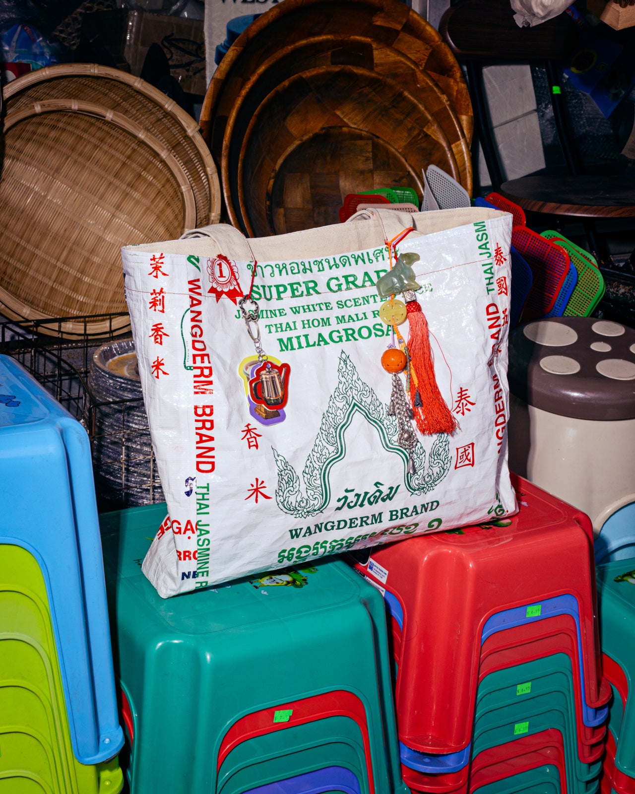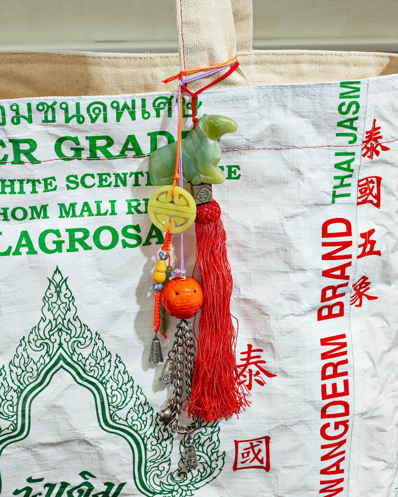 This repurposed rice bag tote reimagines the Wangderm Brand rice bags stocked at Bangkok Grocery. Its canvas-lined interior adds durability for Chinatown grocery hauls to and from wherever you happen to be schlepping. We love the pop of color with the red stitching and the shrinky dink bag charms, as well as the jade, crystal, and silver talisman from Wing on Wo, giving it an extra pop of color for everyday. Bonus change purse included, featuring the checkered all-over print and a sweet custom one-of-a-kind button closure.
