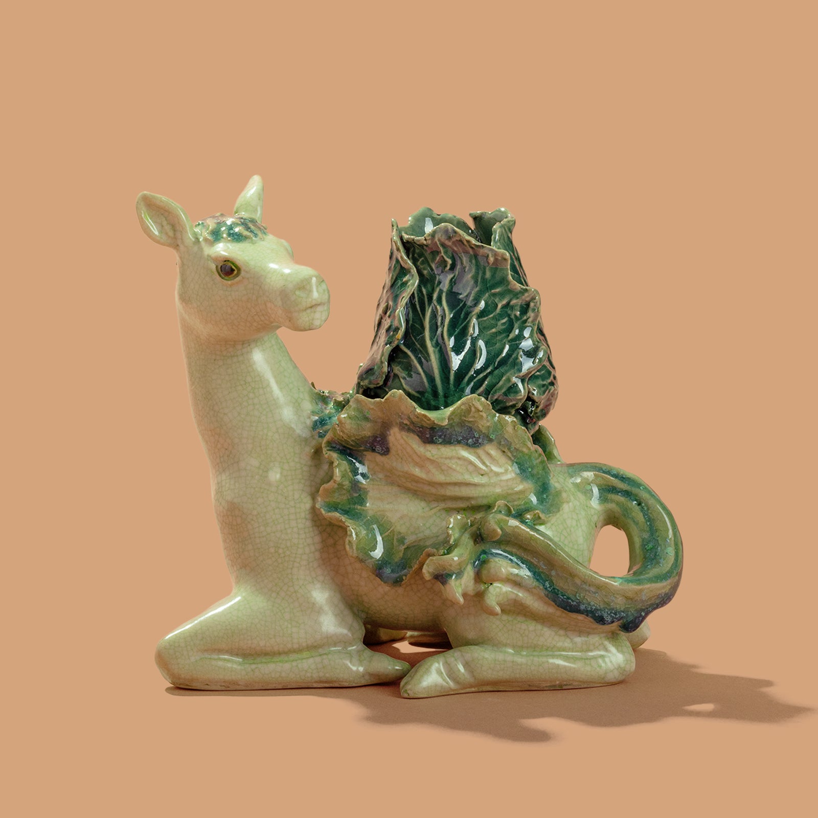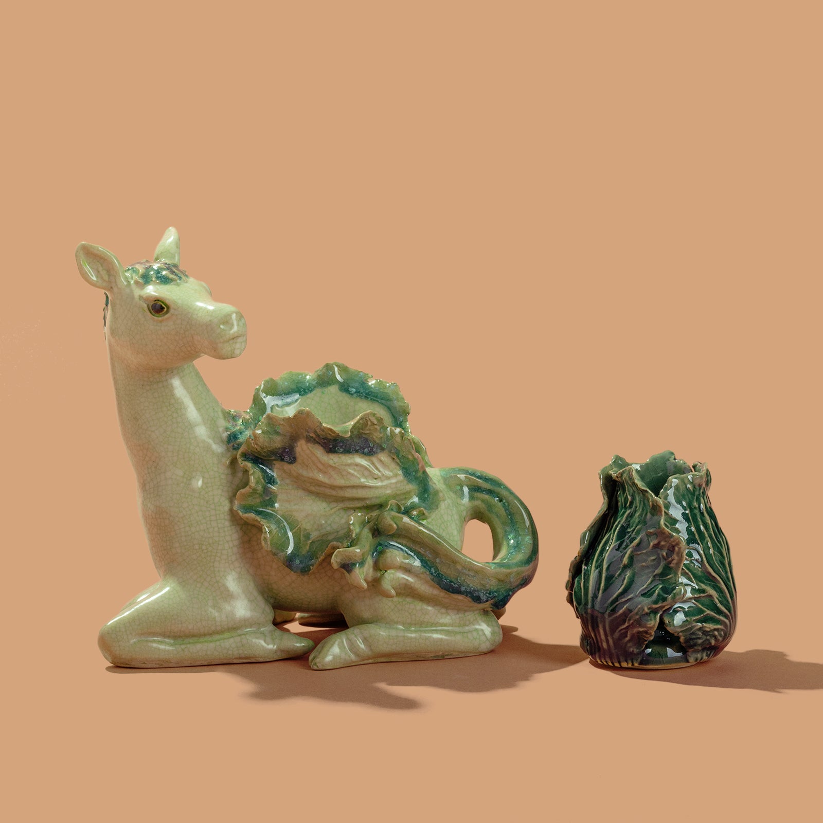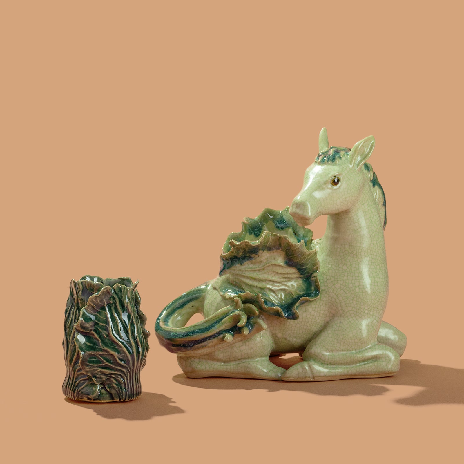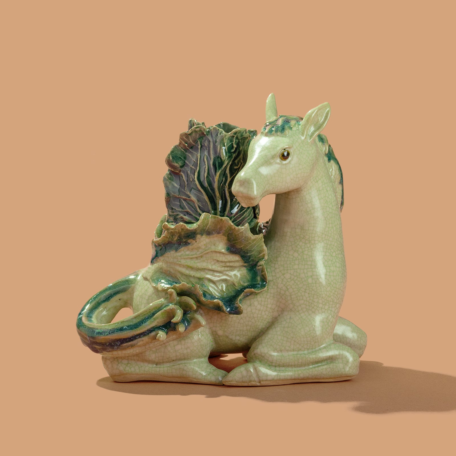 “Yang Radiance” is a collaboration with Korrawit Kanjanakuha of Lamphun’s very own Chuanlhong Ceramic studio for Wing on Wo & Kalm Village in celebration of the upcoming year of the fire horse. The horses are inspired by both WOW’s continued exploration of the classic Chinese cabbage pattern and Korrawit’s practice, rooted in sculptural play and experimental, vibrant glazes. The horses feature a playful rendition of a cabbage saddle that also doubles as a candle or incense holder, along with the use of crackle glazes with unique effects and textures. Perfect to elevate your Lunar New Year altar offering.
