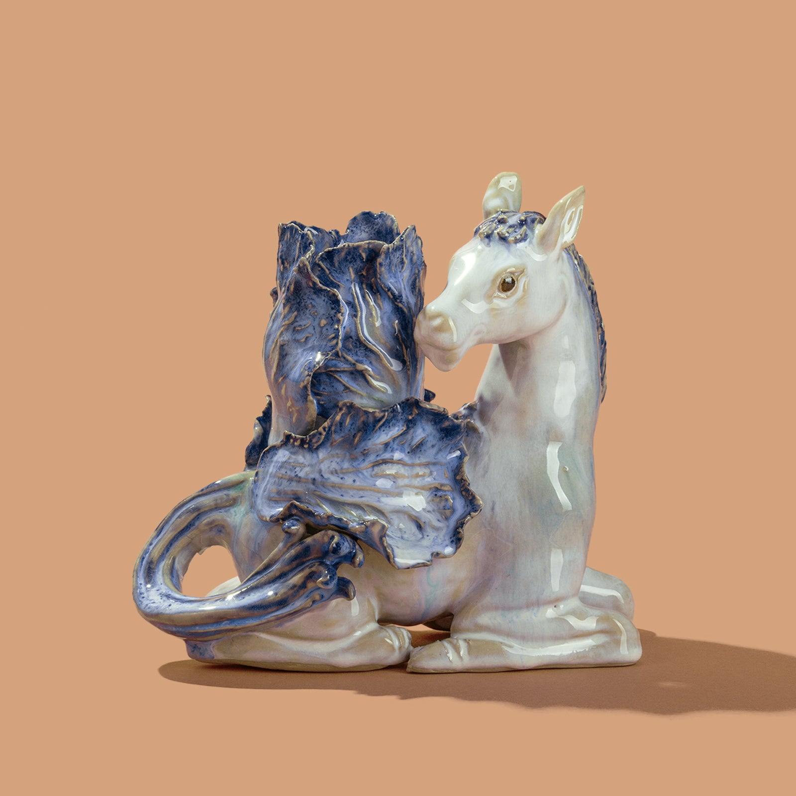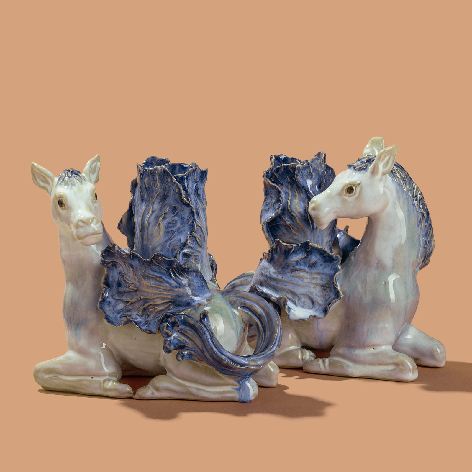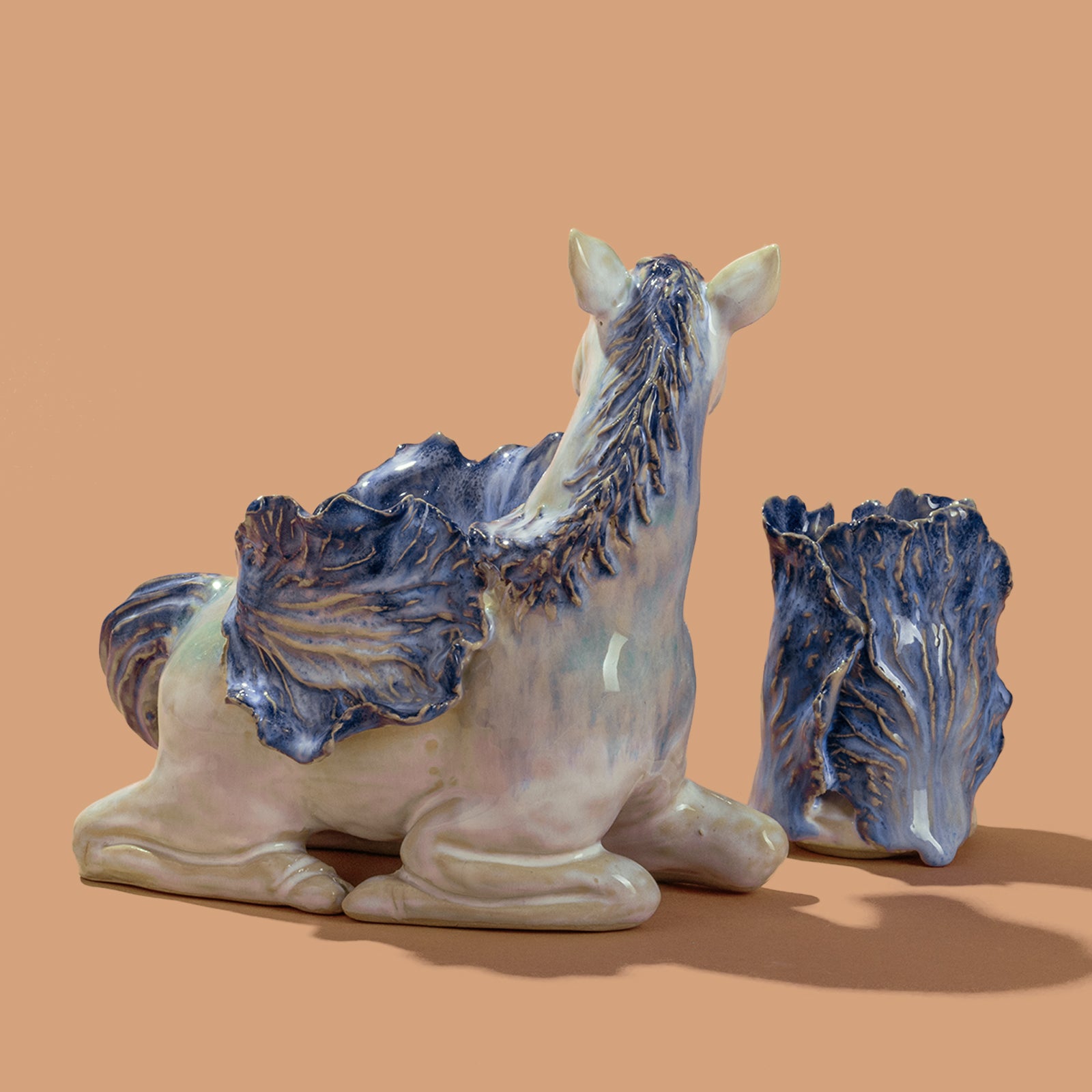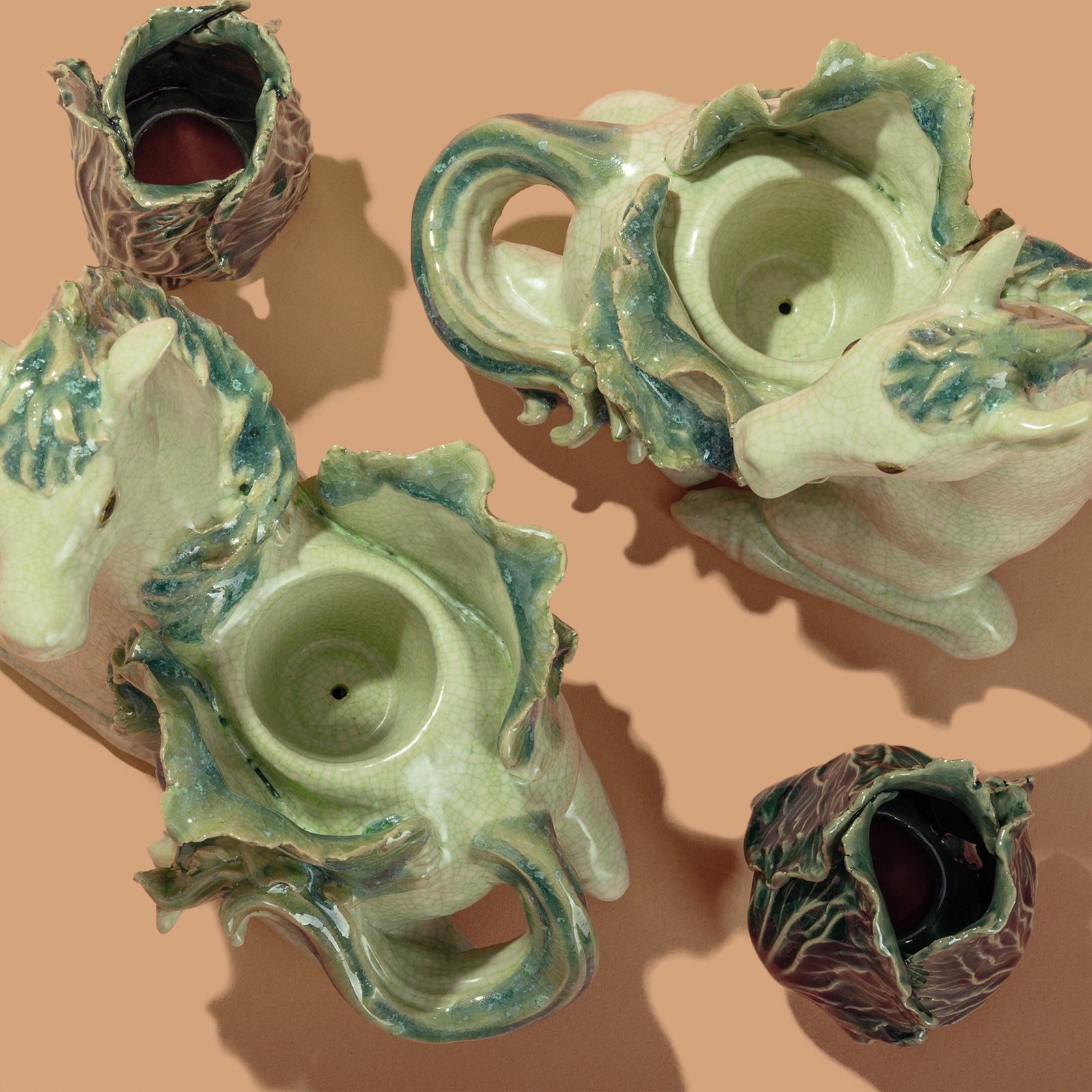 “Yang Radiance” is a collaboration with Korrawit Kanjanakuha of Lamphun’s very own Chuanlhong Ceramic studio for Wing on Wo & Kalm Village in celebration of the upcoming year of the fire horse. The horses are inspired by both WOW’s continued exploration of the classic Chinese cabbage pattern and Korrawit’s practice, rooted in sculptural play and experimental, vibrant glazes. The horses feature a playful rendition of a cabbage saddle that also doubles as a candle or incense holder, along with the use of crackle glazes with unique effects and textures. Perfect to elevate your Lunar New Year altar offering.